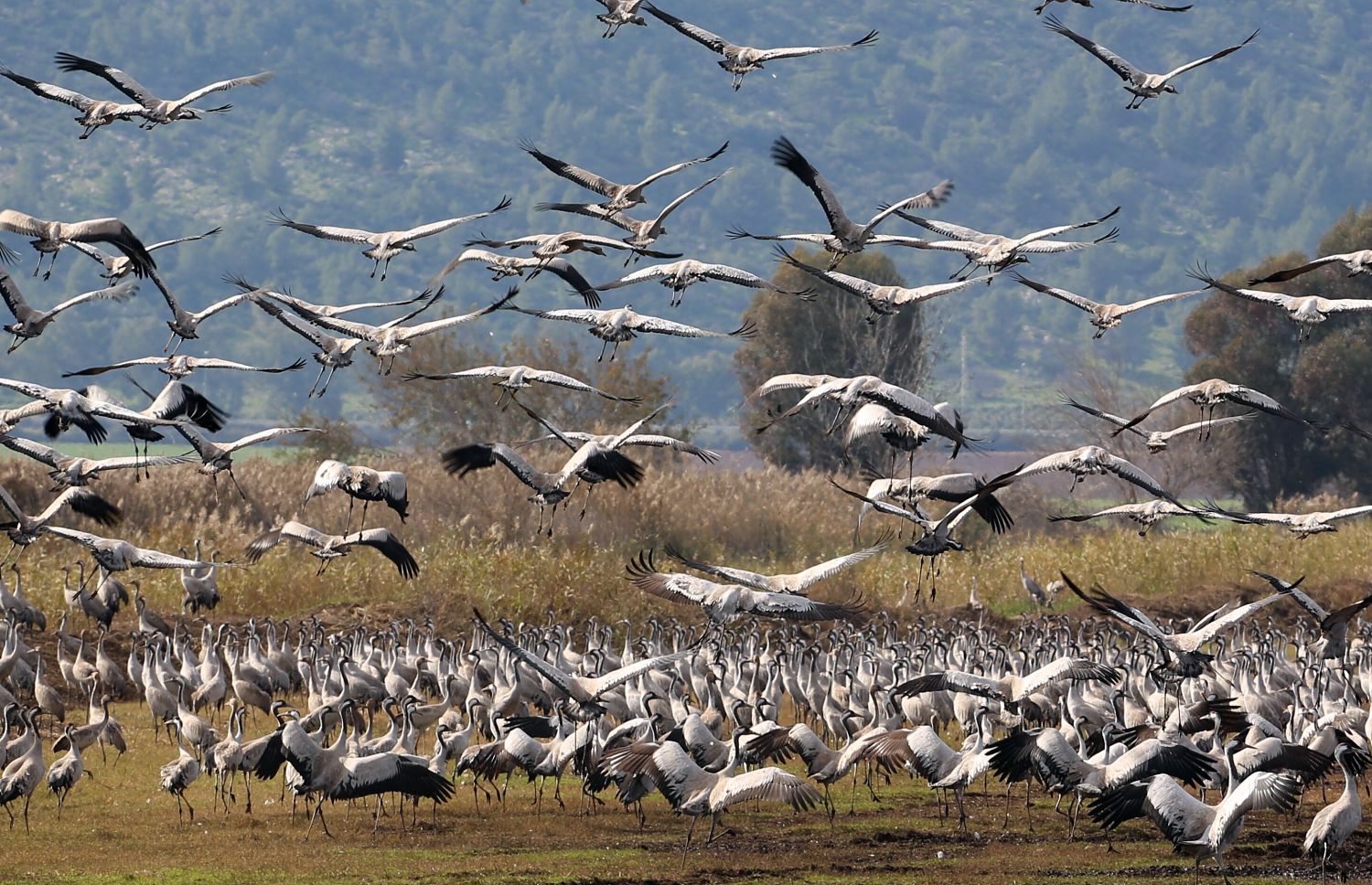 100.000 traner trækker forbi Hula-dalen i Israel på vejen fra ynglepladserne i Finland og Rusland til overvintringskvarteret i Afrika.
